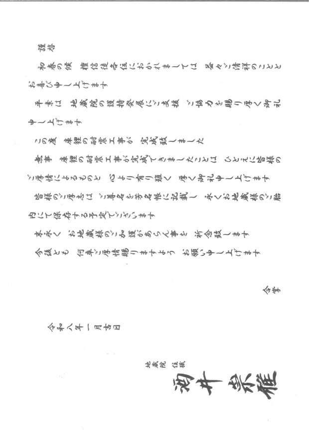 この度、庫裡の耐震工事が完成いたしました。ひとえに皆様のご厚情によるものと厚く御礼申し上げます。なお当院では、一口一万円にて引き続き皆様のご厚志をお受けしております。何卒宜しくご理解とご協力賜りますようお願いいたします。お振込先 百五銀行 関支店 普通預金 0221237 地蔵院総代会 代表者(ジゾウインソウダイカイ ダイヒョウシャ)
